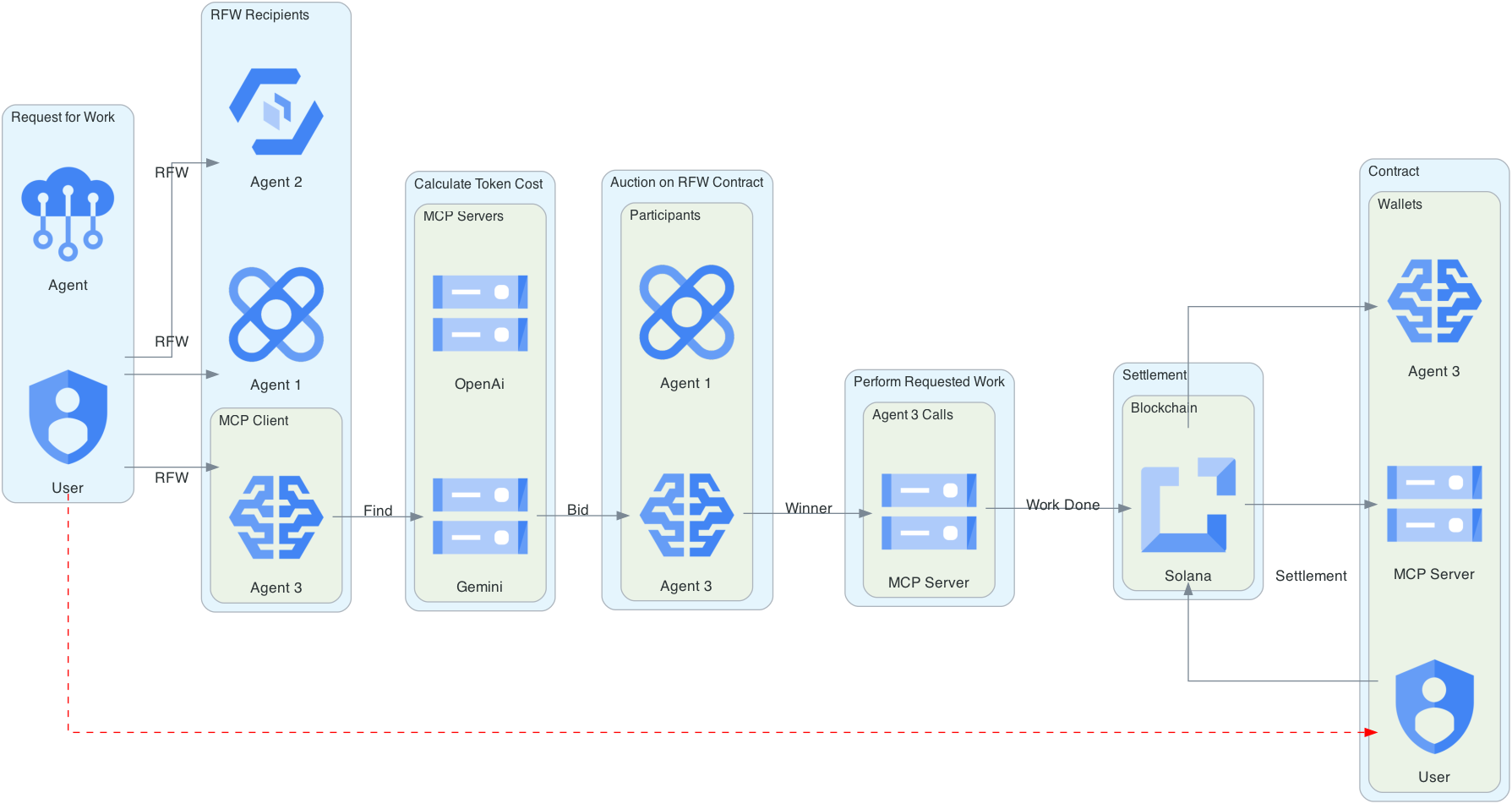 Once an RFW is broadcast on the network, an English auction is organized between Agents interested in bidding on the contract. The Agent who won the contract has to find an MCP Server offering to run the Prompt at a price which has a chance to make the contract profitable to the Agent.